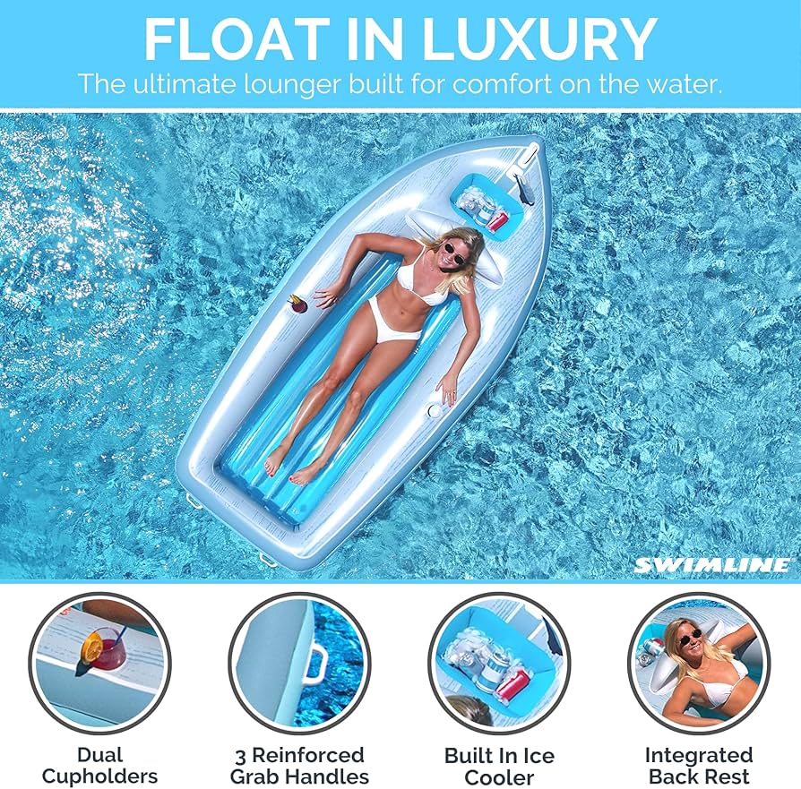 The Swimline Classic Cruiser is a picnic boat style lounger. This roomy luxury lounger has a built-in ice chest & 2 cup holders for added convenience. It’s bow flag will add flair to your swimming pool!