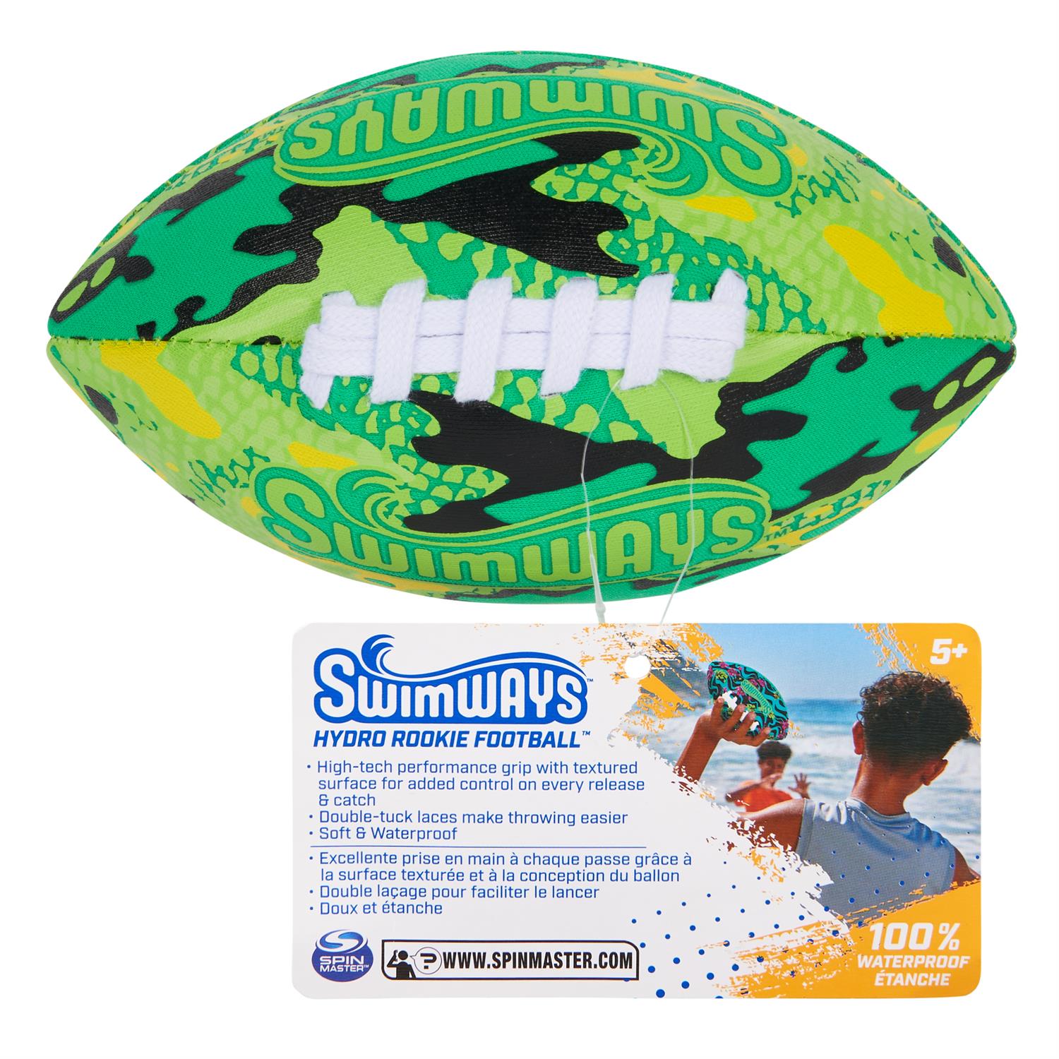 Go long with the Hydro Rookie Football - even into the swimming pool! Coop Hydro Rookie Balls are 100 percent waterproof football balls that float, don't get waterlogged, and perform great in all conditions. Measuring 6 inches long, these toy footballs are easy to grip and throw, and soft to catch. Great for pools, trips to the beach, and backyard play. Cool graphic print covers appeal to kids and add to the fun!