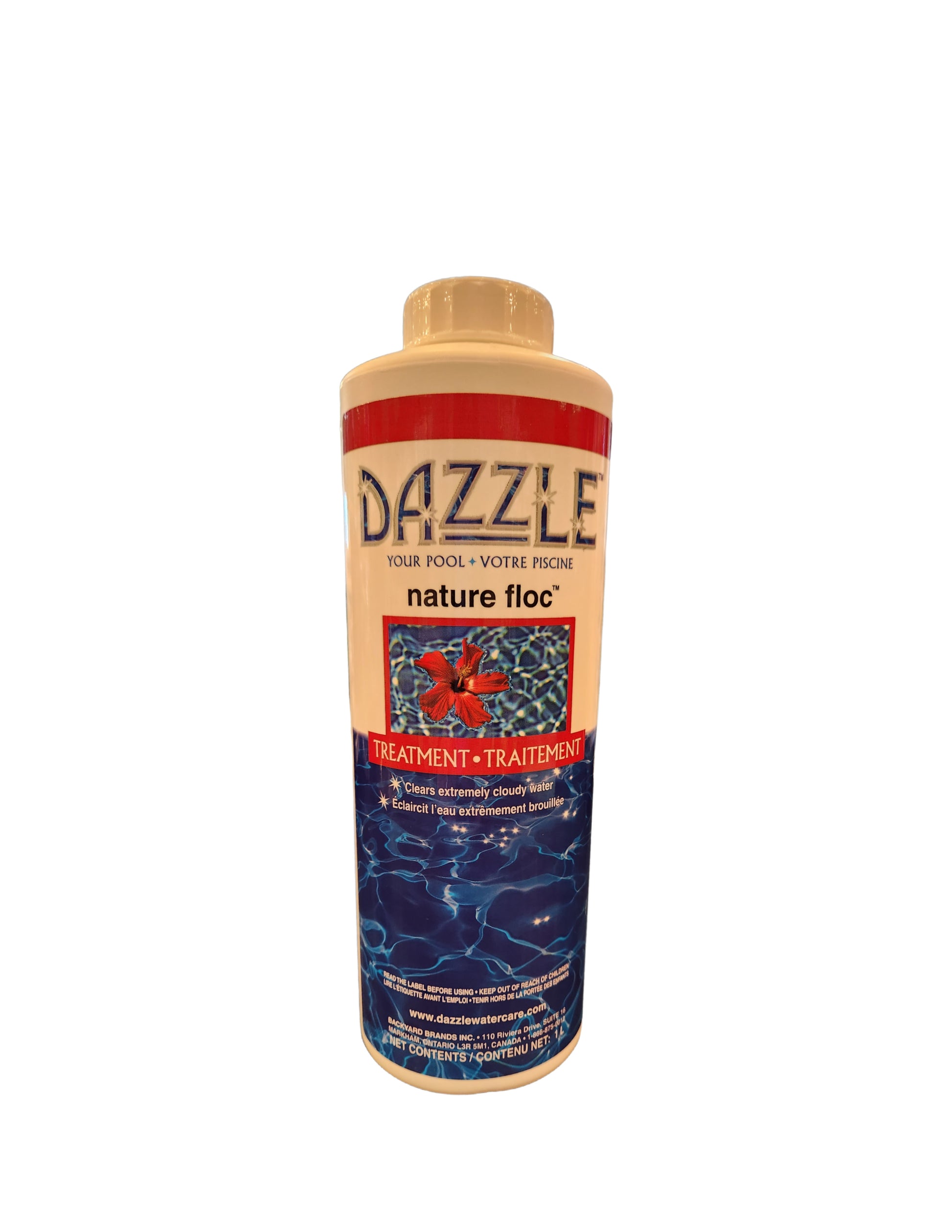 Dazzle Nature Floc is highly effective at restoring water clarity by flocculating particles that cause cloudiness, haze and water discoloration. This product coagulates debris and quickly drops it to the bottom of the pool so that it can be easily vacuumed out. Nature Floc will not affect pH and works with all pool types, water sanitizing programs and filter types.